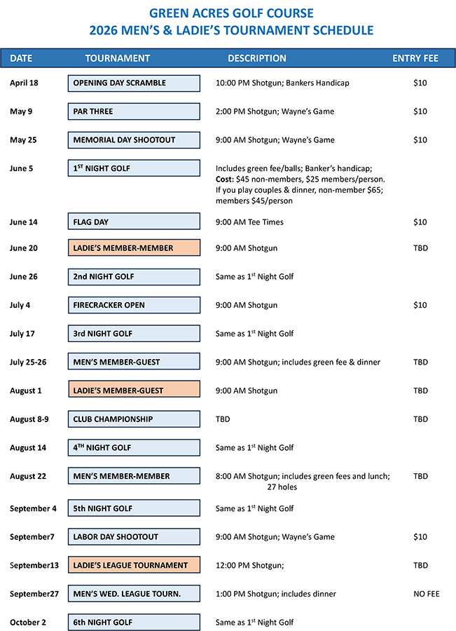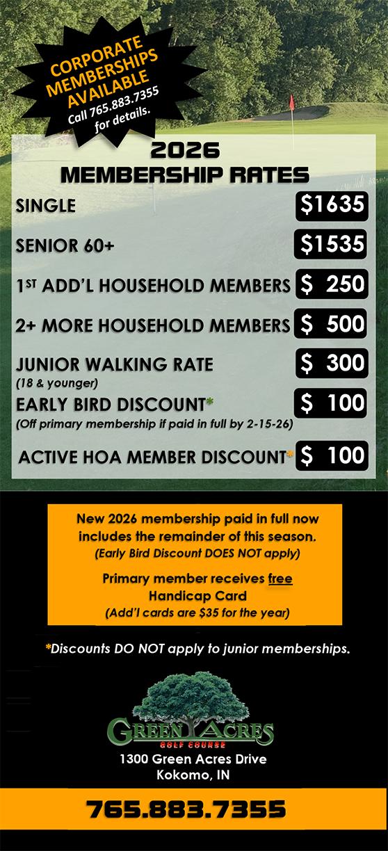 Green Acres offers four sets of tees ranging from 4994 yards to 6811 yards allowing players to select the tees to best suit their ability. The public course features bentgrass greens, blue grass fairways and roughs framed by 37 bunkers creating both beauty and challenge. Green Acres Golf Course was designed by Robert Simmons and is an excellent choice for your regular rounds of golf or a new destination for you and friends when visiting Kokomo.